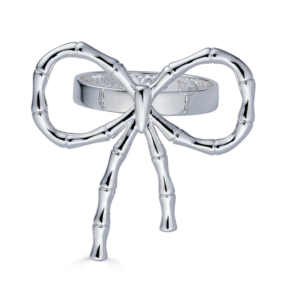 Bring a touch of elegance to your tablescape with the Constance Ford Silver Bamboo Bow Napkin Rings. Crafted with precision from triple-plated Silver-plated brass and hand-polished to perfection, these Chinoiserie-inspired Silver bow napkin rings add a luxurious touch to any luncheon, dinner, or shower. Make every moment special with this beautiful, sophisticated napkin ring. Also available in Gold plated.